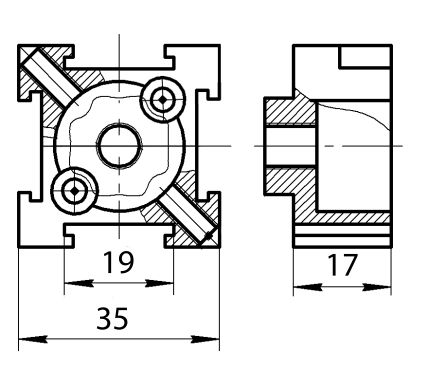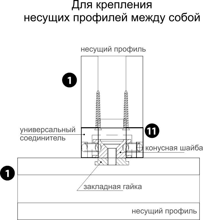 В комплект универсального соединителя входят: колодка из цинкового сплава, конусная шайба, зажимные винты, саморезы. Крепится к торцу несущего профиля.